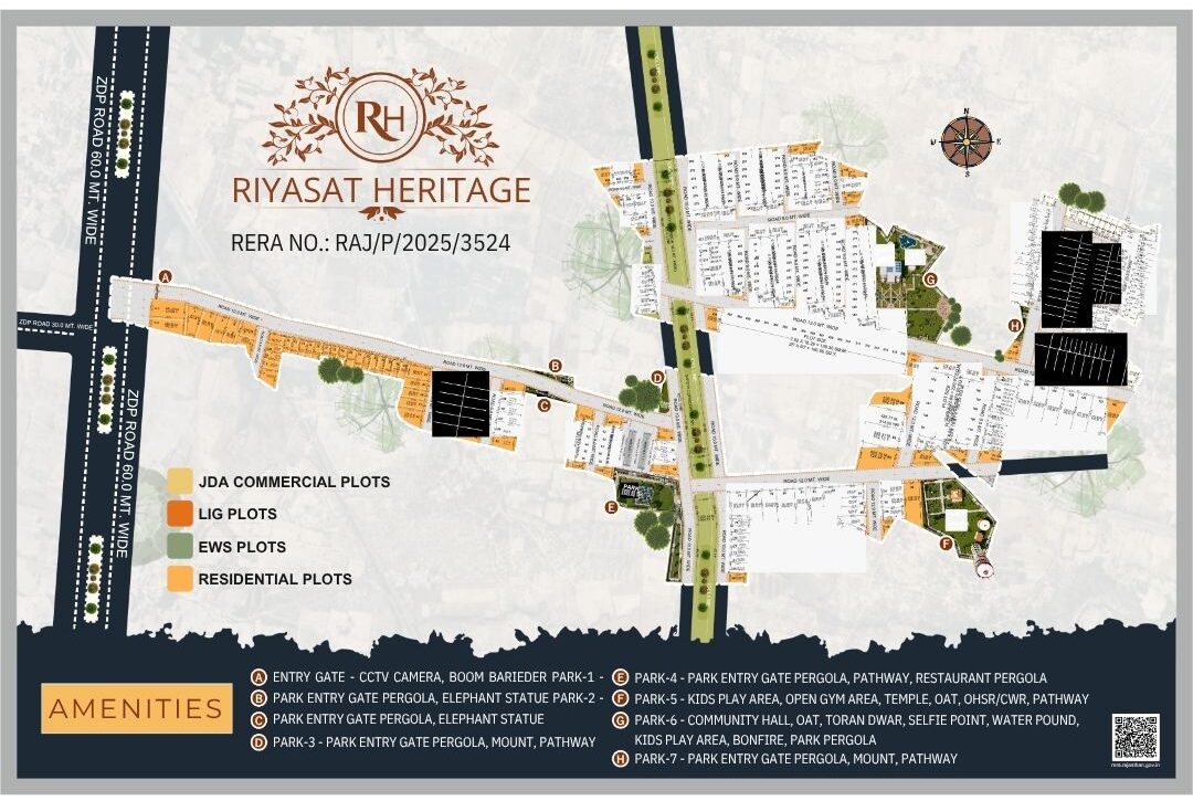 Amenities: Entry gate with CCTV & boom barrier; Parks with pergolas, elephant statues, mounts, pathways, restaurant pergola; Kids play area; Open gym; Temple; OAT; OHSR/CWR; Community hall; Toran Dwar; Selfie point; Water pond; Bonfire area